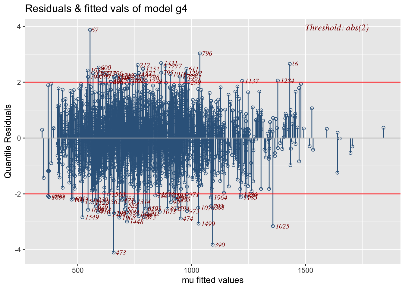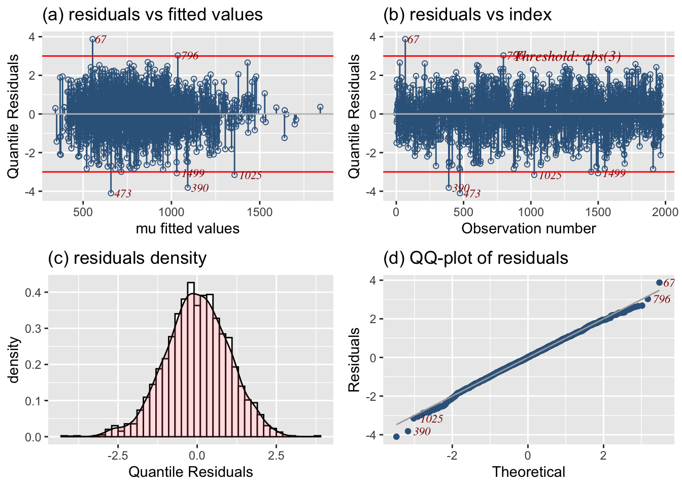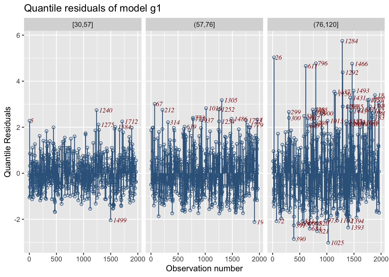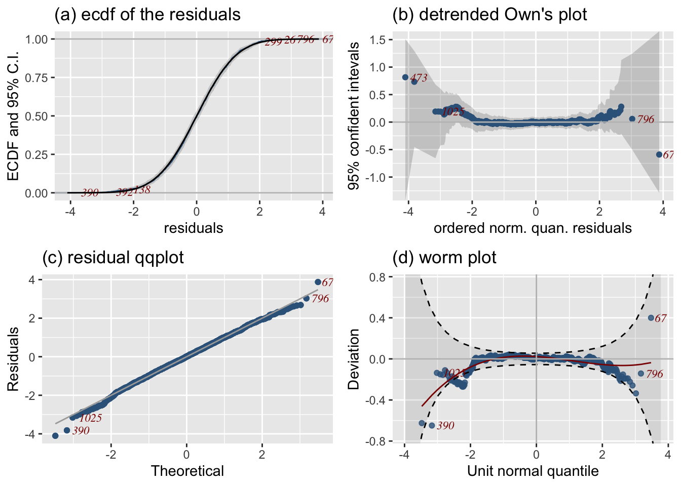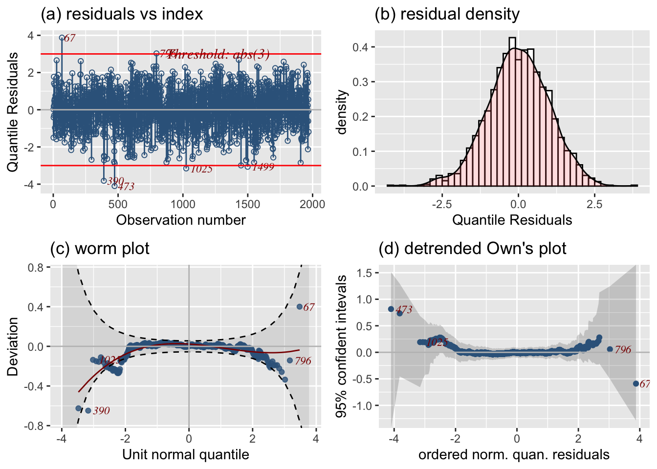 Residual-based diagnostics - resid_NAME() – Diagnostics on residuals E.g., resid_wp() produces a worm plot for assessing the distribution.