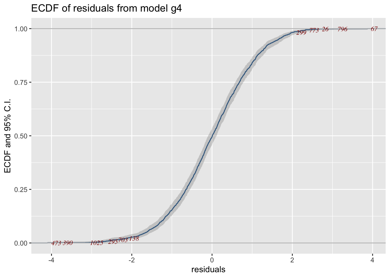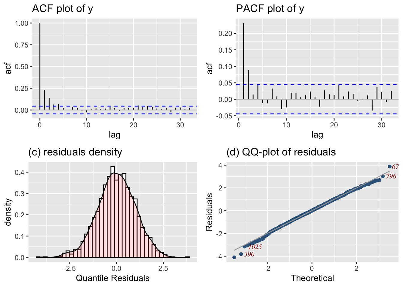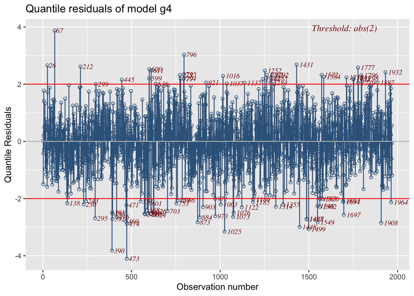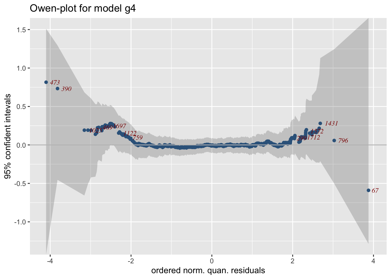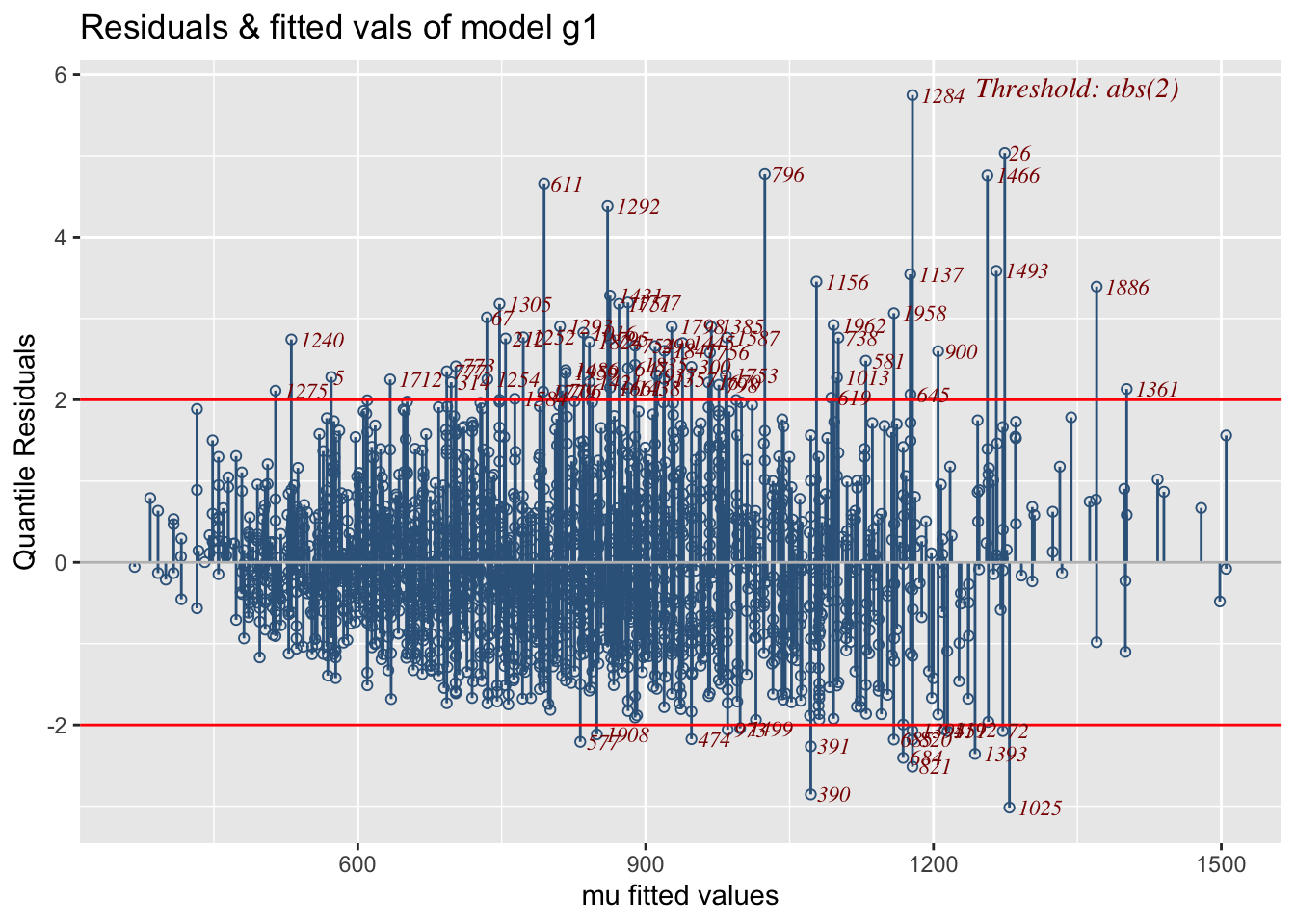 Residual-based diagnostics - resid_NAME() – Diagnostics on residuals E.g., resid_wp() produces a worm plot for assessing the distribution.