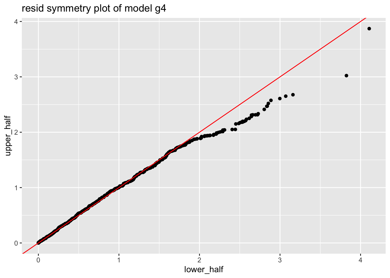 resid_symmetry()A symmetry plot is useful for detecting asymmetry (skewnwess) in the residuals. Here we plot the symmetry plot of the residuals for model m4.
