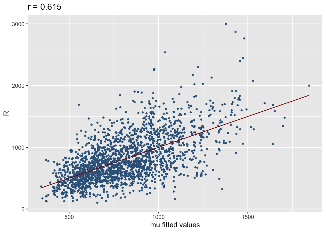 Figure 30 plots the response variable against the fitted values for \(\mu\). The plot also show the 45 degrees line between the two variables. The relation should be close to linear as possible. The correlation between the response and the fitted values for \(\mu\) is 0.6031942, -0.1262289 which is reasonable hight.