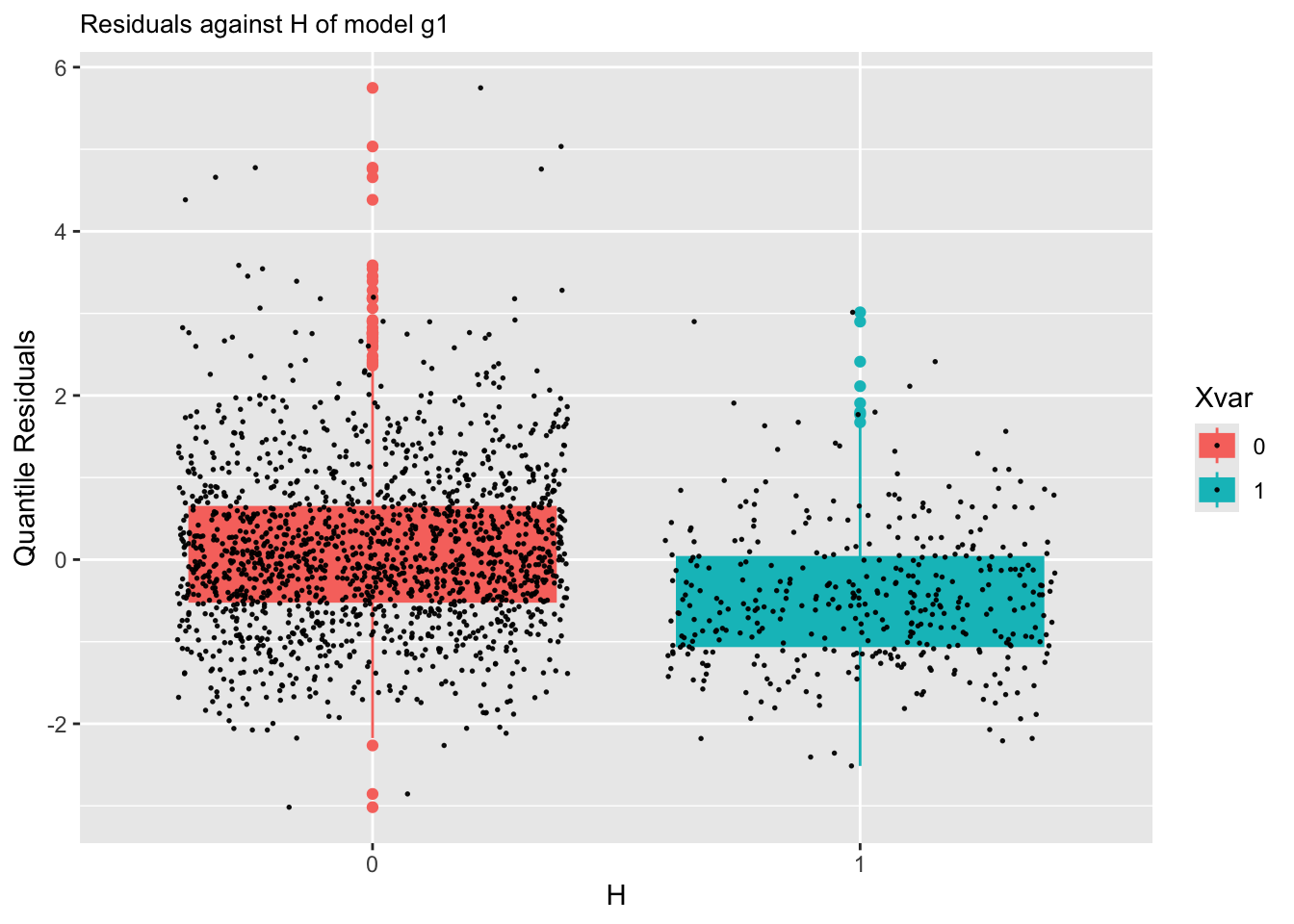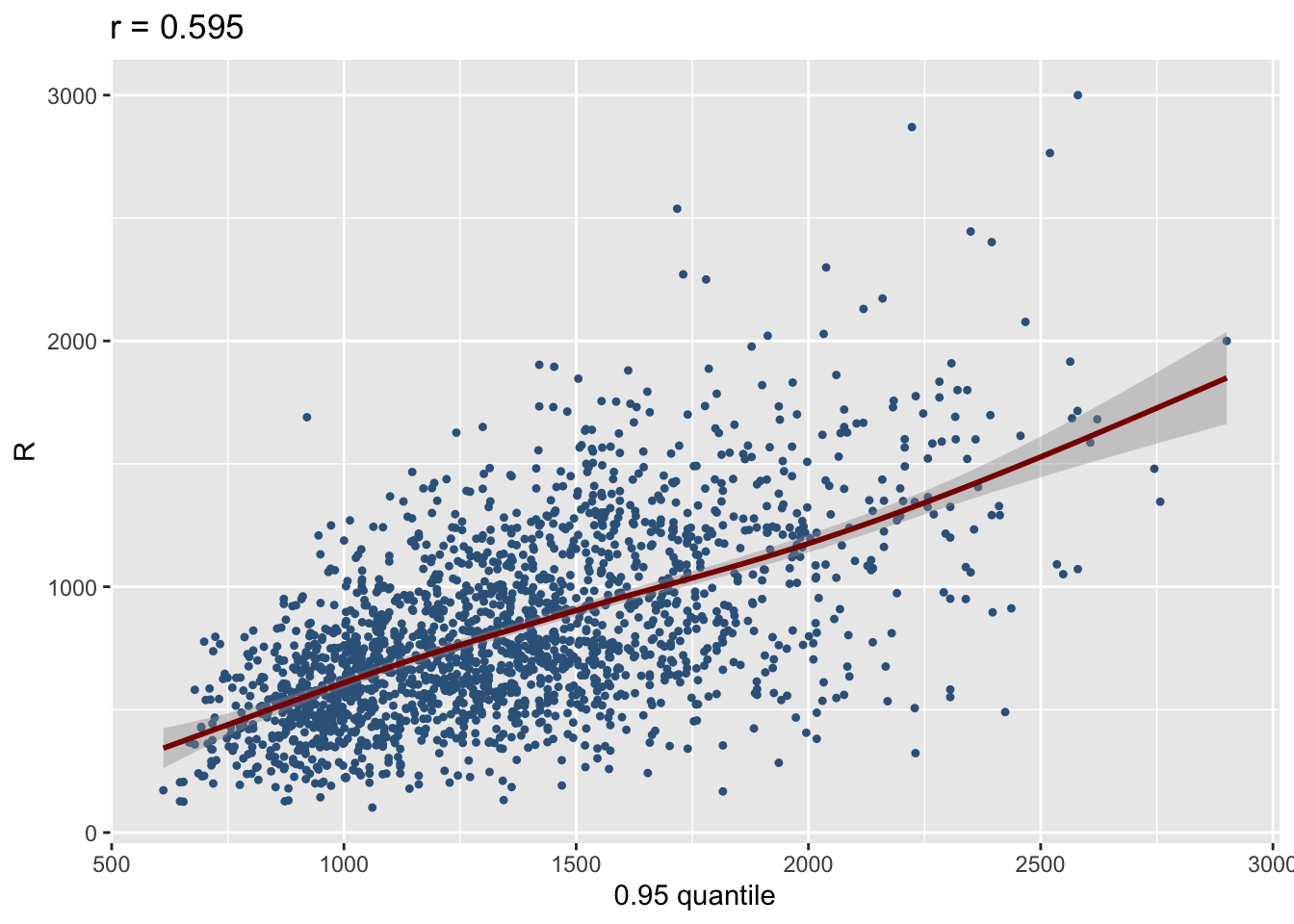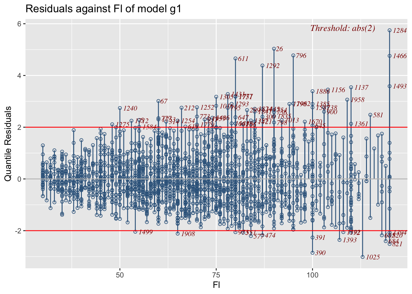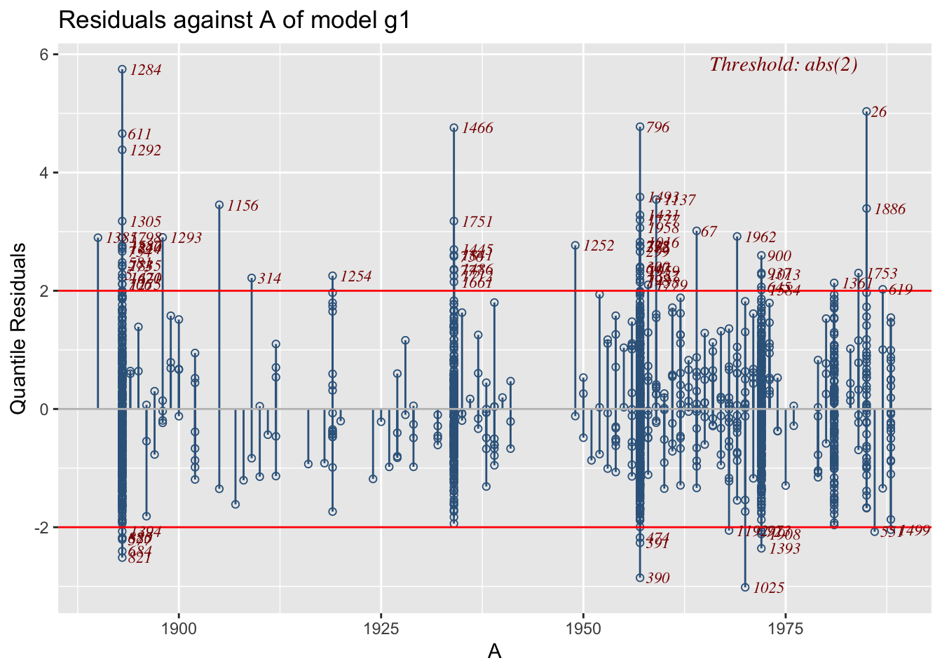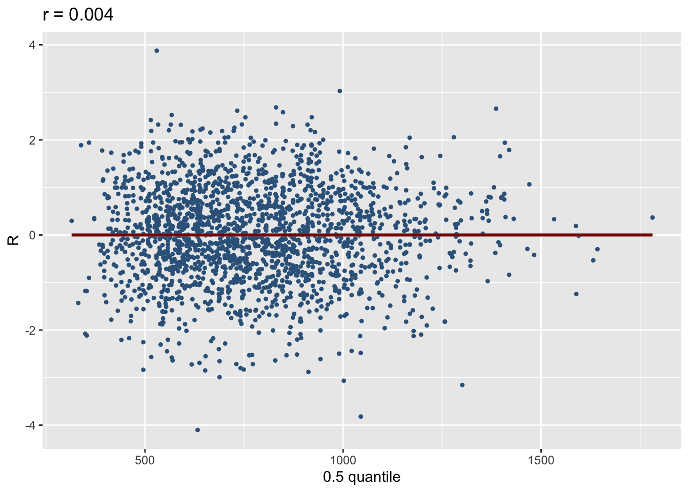 resp_quantileThe function resp_quantile plots the response variable against any fitted quantile. Here we plot the respose against the 0.95 quantile. Again the interpretation needs more thought.