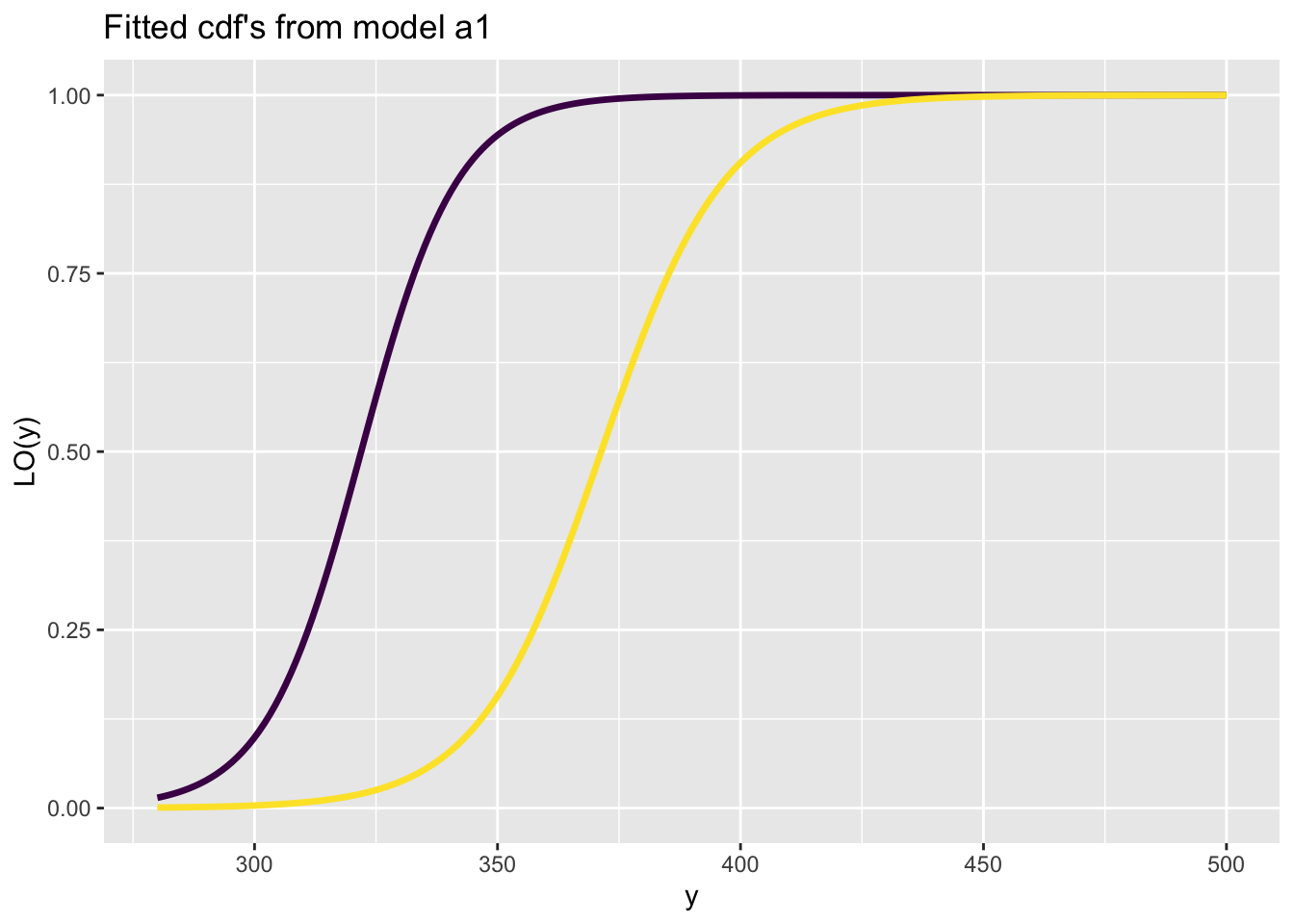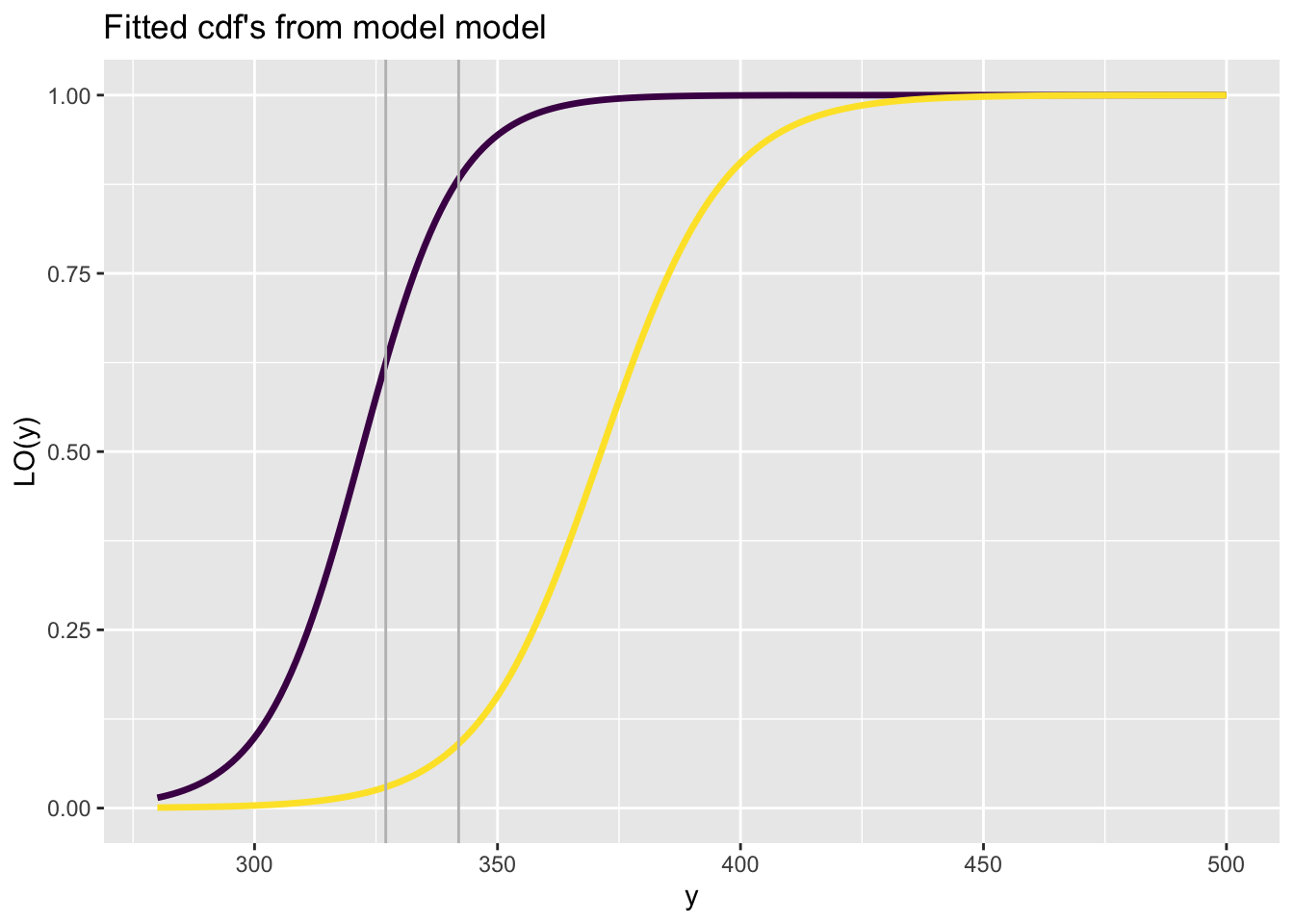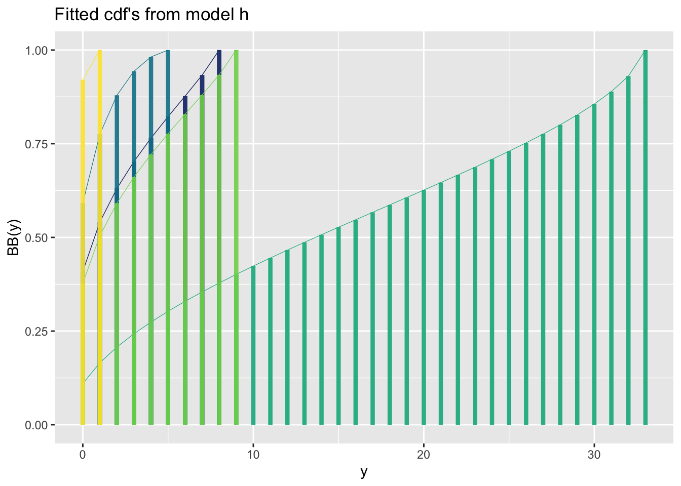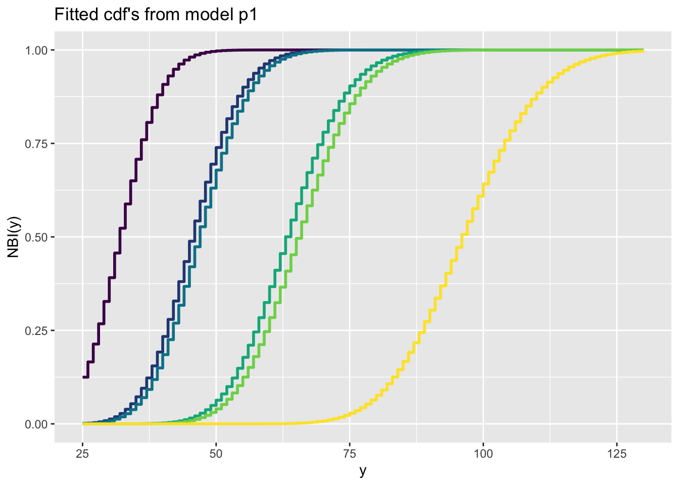 fitted_cdf()The function fitted_cdf() plots individual pdf’s from a fitted model. It needs the argument obs indicating which observation number to plot. %