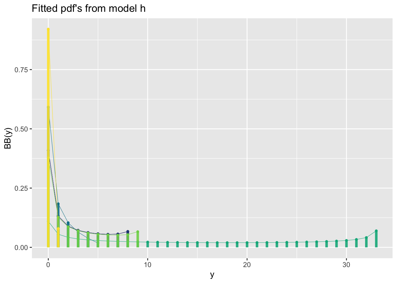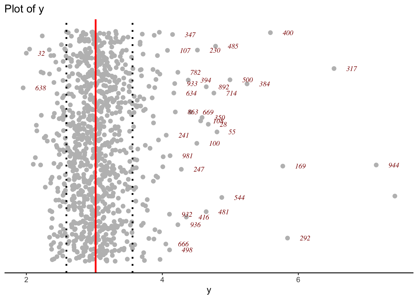 y_dots()The dots function is appropriate for long tail distributions be cause emphasise the the long left ot right tail of \(y\).