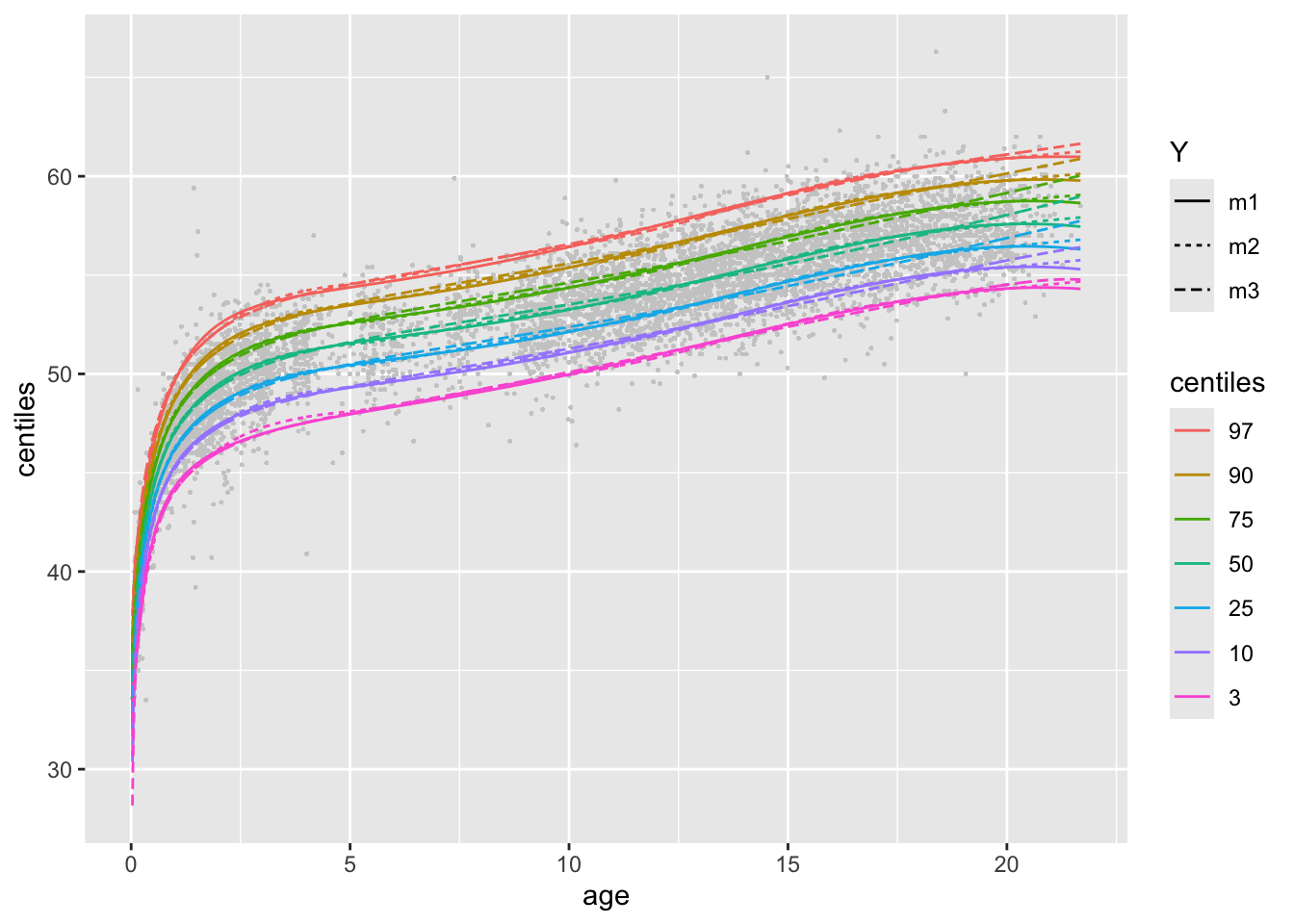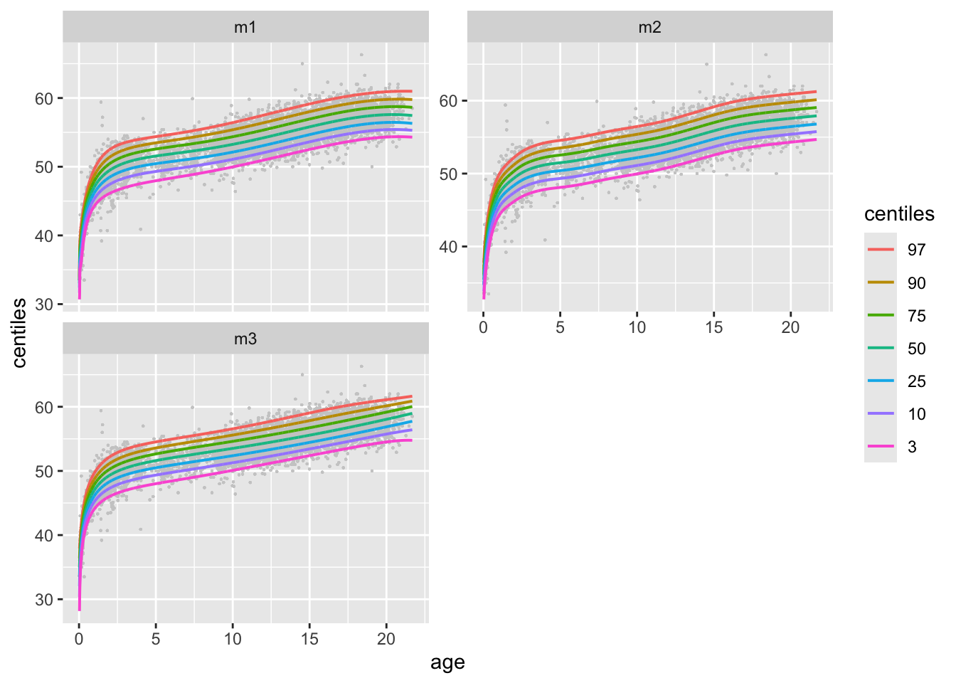Here we use three different GAMLSS models. Note that for all centile functions the name of the x-variable should appear in the plotting function as in the actual data otherwise the function will not find it: