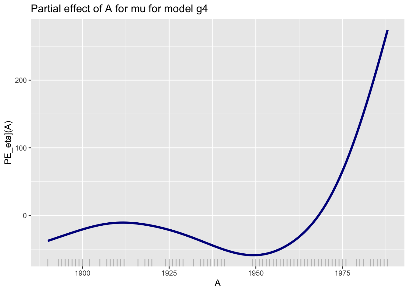 pe_param()The function pe_param() plots the partial effect of one or two specified term(s) given all other terms in the model remain fixed at predetermined values. Depending on length of the argument term the function pe_param() uses the function pe_1_param() or pe_2_param() to plot the partial effects. Here we plot it against a continuous variable A:
