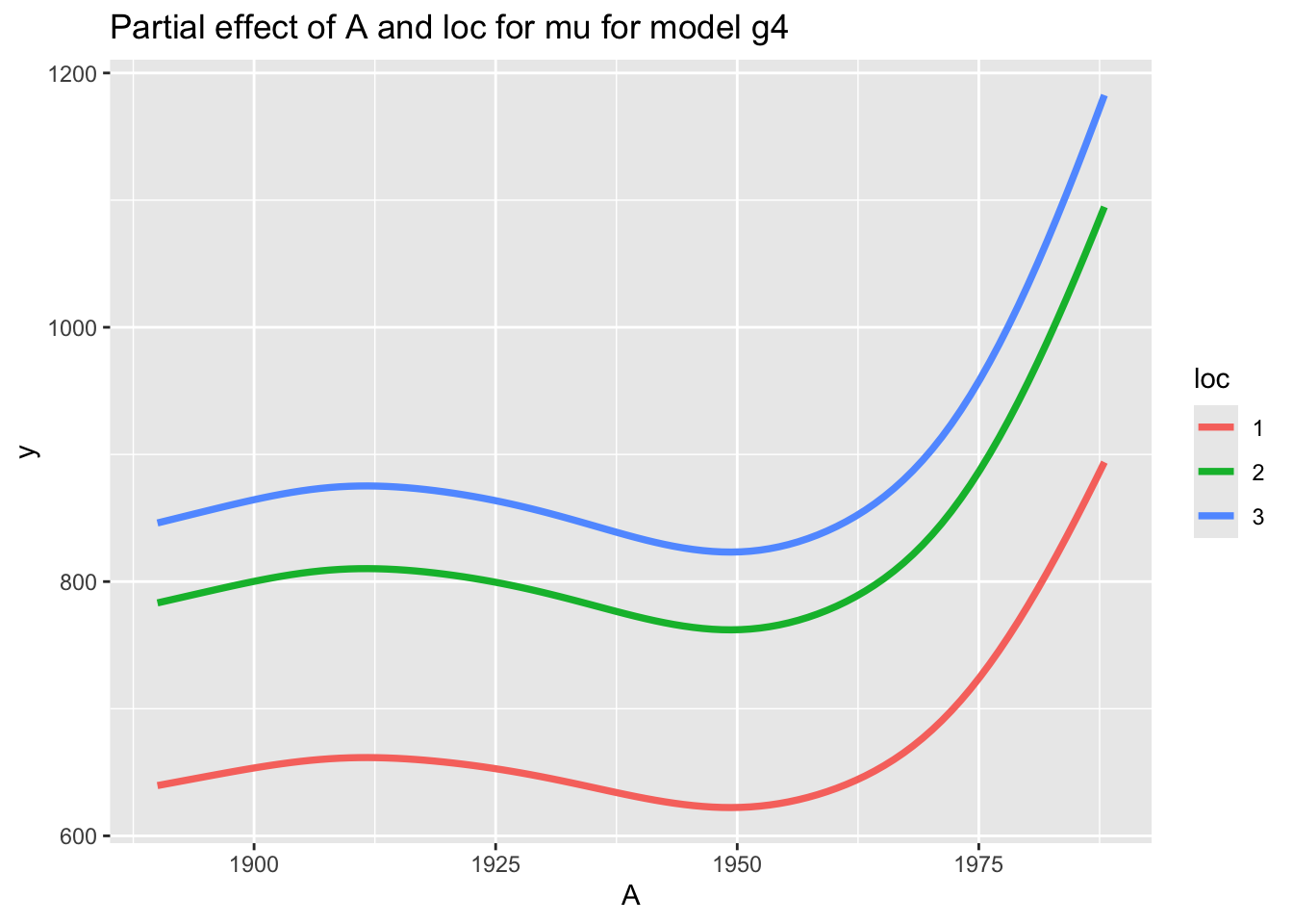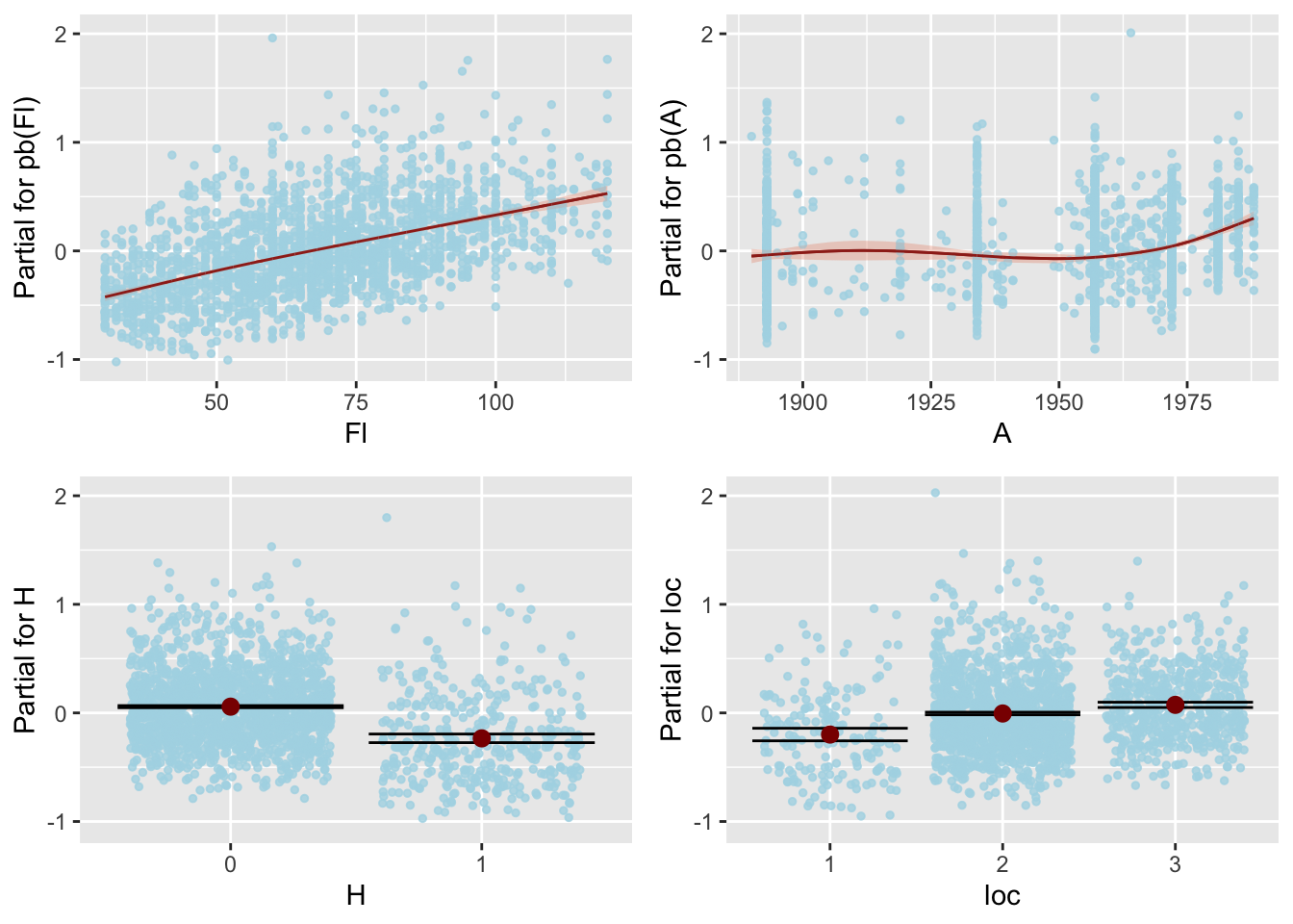 Fit additive smooth terms for Fl and A and main effects for H and loc in the \(\mu\) using Gamma distribution.