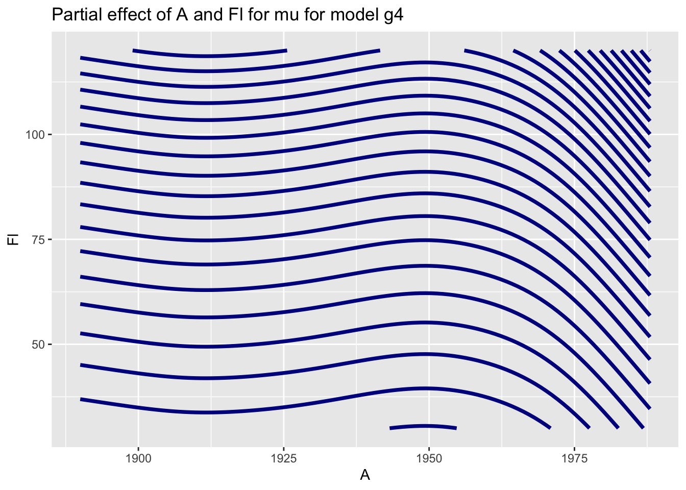 Fit additive smooth terms for Fl and A and main effects for H and loc in both \(\mu\) and \(\sigma\) parameters using Gamma distribution.