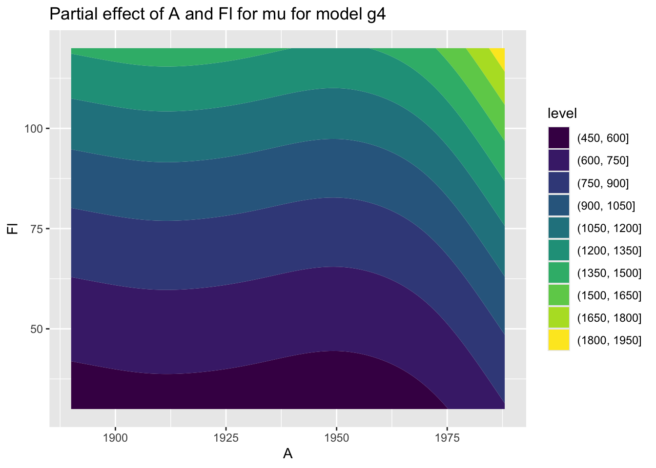 Fit interaction smooth terms for Fl and A in \(\mu\), additive main smooth effect for for Fl and A in \(\sigma\) and main effects for H and loc in both \(\mu\) and \(\sigma\) using a gamma family.