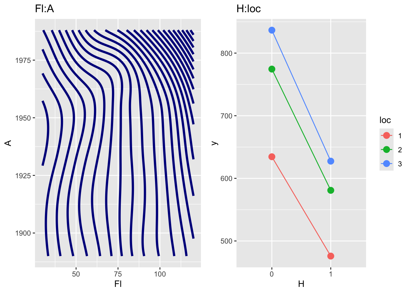 m6. Note that the plot on the left panel is a genuine first order interaction term fitted with a 2 dimensional smoother using the interface with the package mgcv while the plot on the right panel is created using the two factors H and loc is just a two dimensional plot of the two main effects for H and loc respectively, since no interaction was fitted for those two terms
