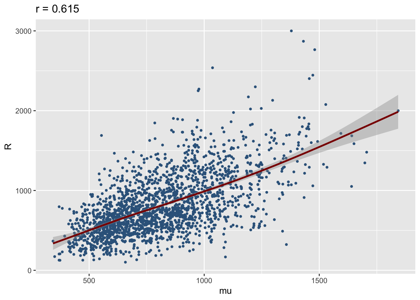 resp_mu()Plotting, the response variable against the fitted values is a traditional way of checking the adequacy of the model in linear regression model situation. The closer the points of the plot to 45% line the better the model. Also a hight correlation coeficient indicates a good fit. For GAMLSS this is equivalent of plotting the response against the fitted values of the \(\mu\) model. A strong linear pattern indicates that the \(\mu\) model is adequate.