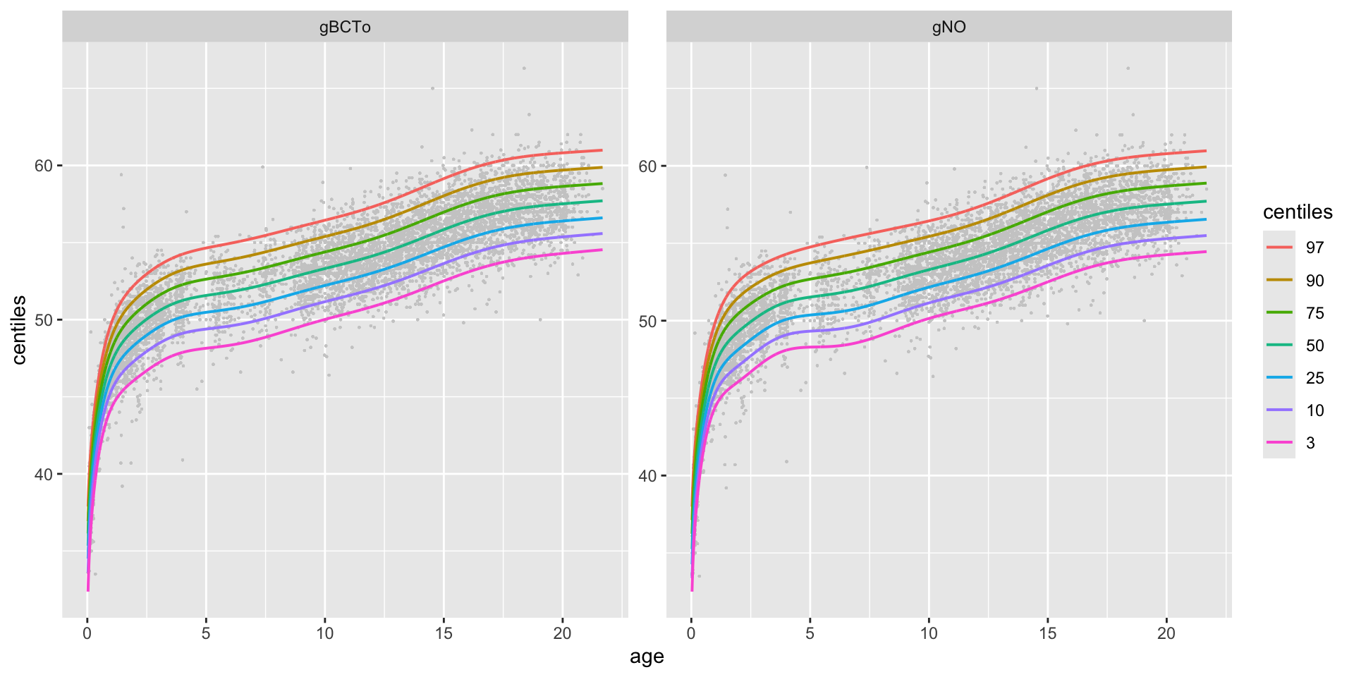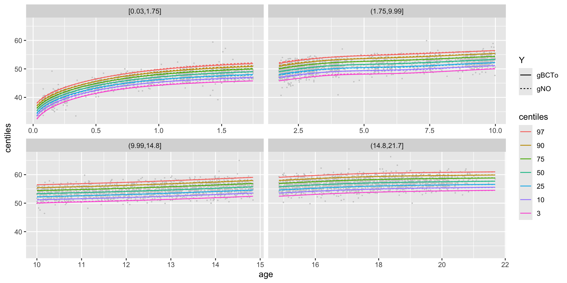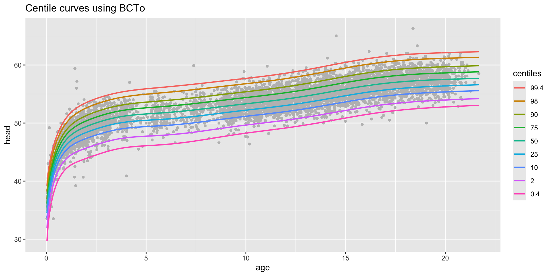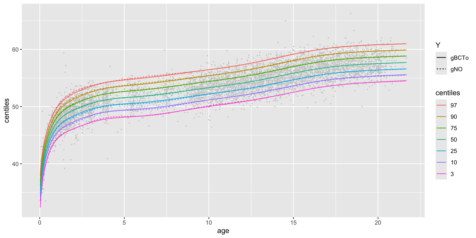 \[\begin{eqnarray} z = \frac{1}{\sigma \nu} \left[\left( \frac{y}{\mu}\right)^{\nu}-1 \right], & \ \textrm{if} \ \nu \neq 0 \nonumber \\ = \frac{1}{\sigma}\log\left(\frac{y}{\mu}\right), & \ \textrm{if} \ \nu =0. \nonumber \end{eqnarray}\]LMS methodif \(Z \sim N(0,1)\) then \(Y \sim BCCG(\mu, \sigma, \nu) =\) LMS method