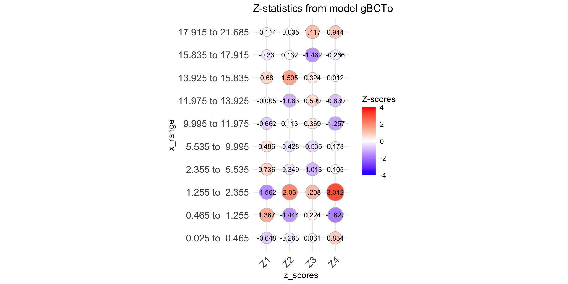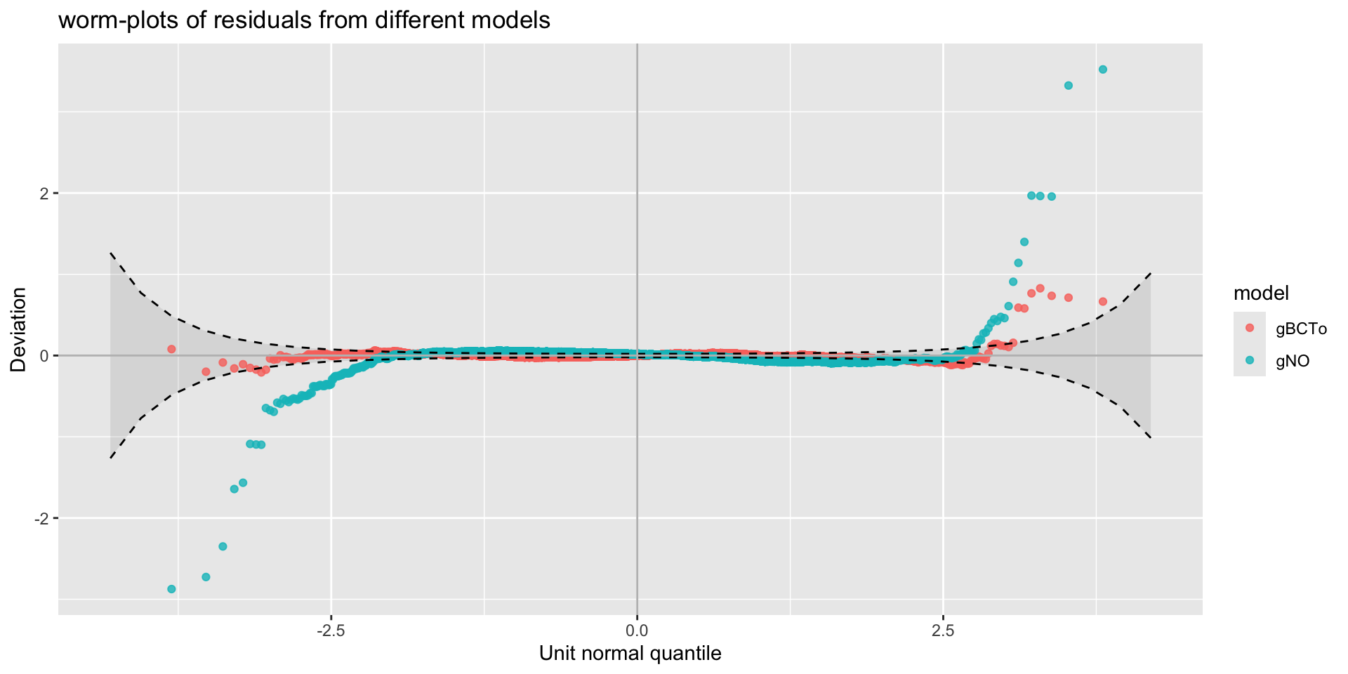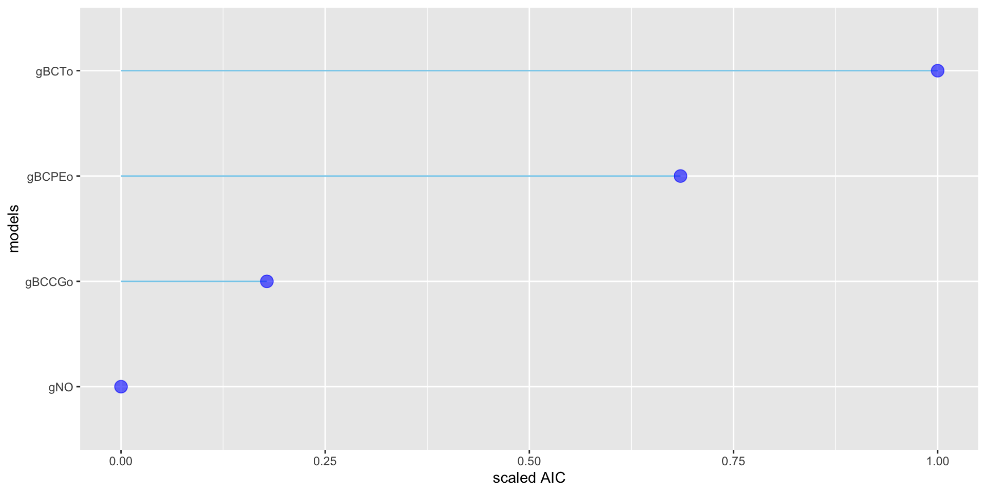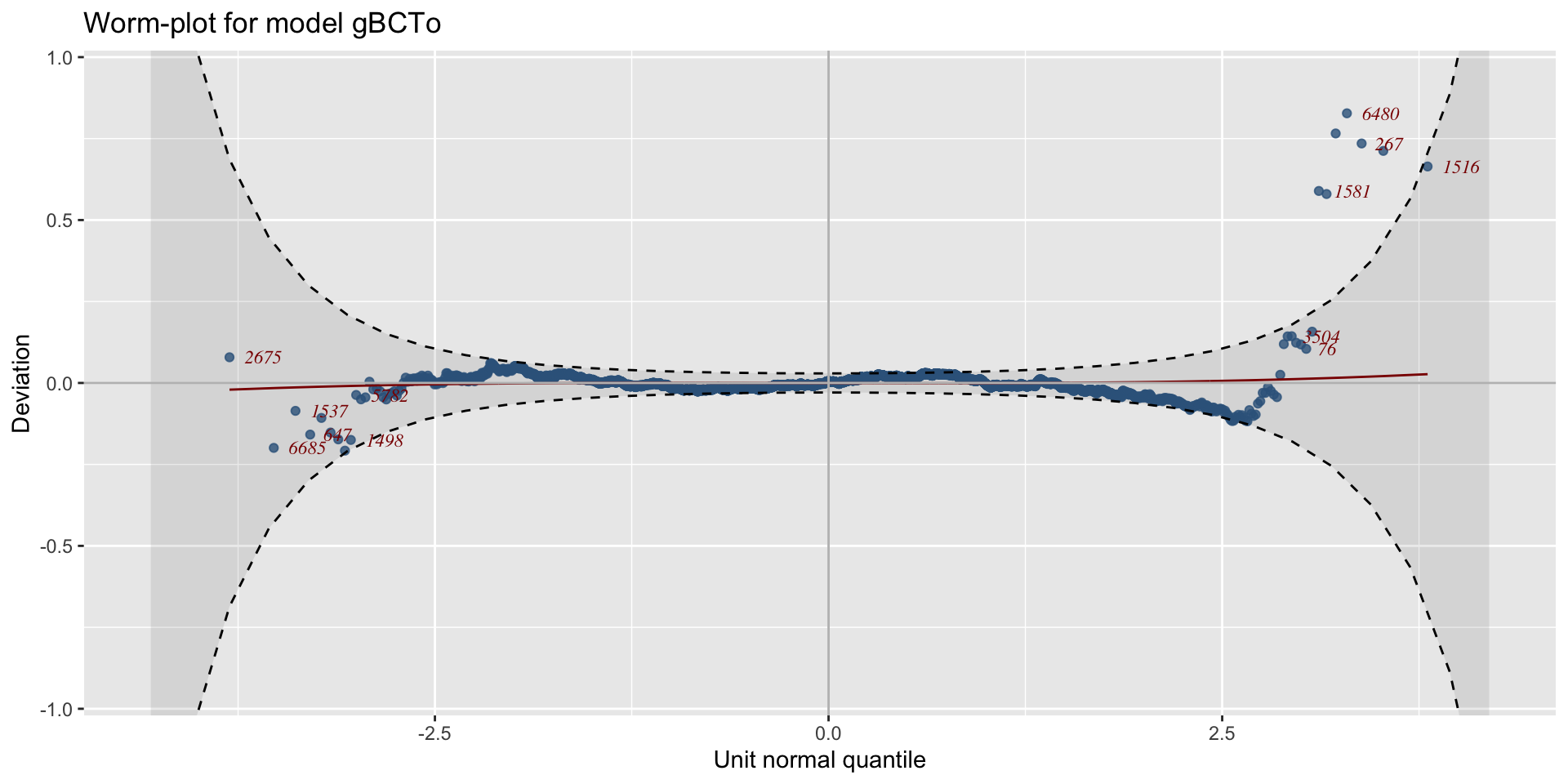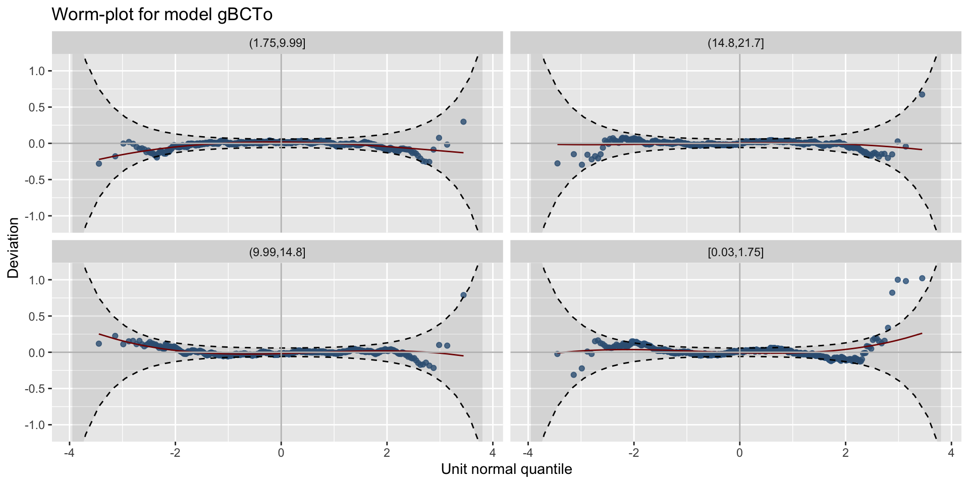 \[\begin{eqnarray} z = \frac{1}{\sigma \nu} \left[\left( \frac{y}{\mu}\right)^{\nu}-1 \right], & \ \textrm{if} \ \nu \neq 0 \nonumber \\ = \frac{1}{\sigma}\log\left(\frac{y}{\mu}\right), & \ \textrm{if} \ \nu =0. \nonumber \end{eqnarray}\]LMS methodif \(Z \sim N(0,1)\) then \(Y \sim BCCG(\mu, \sigma, \nu) =\) LMS method
