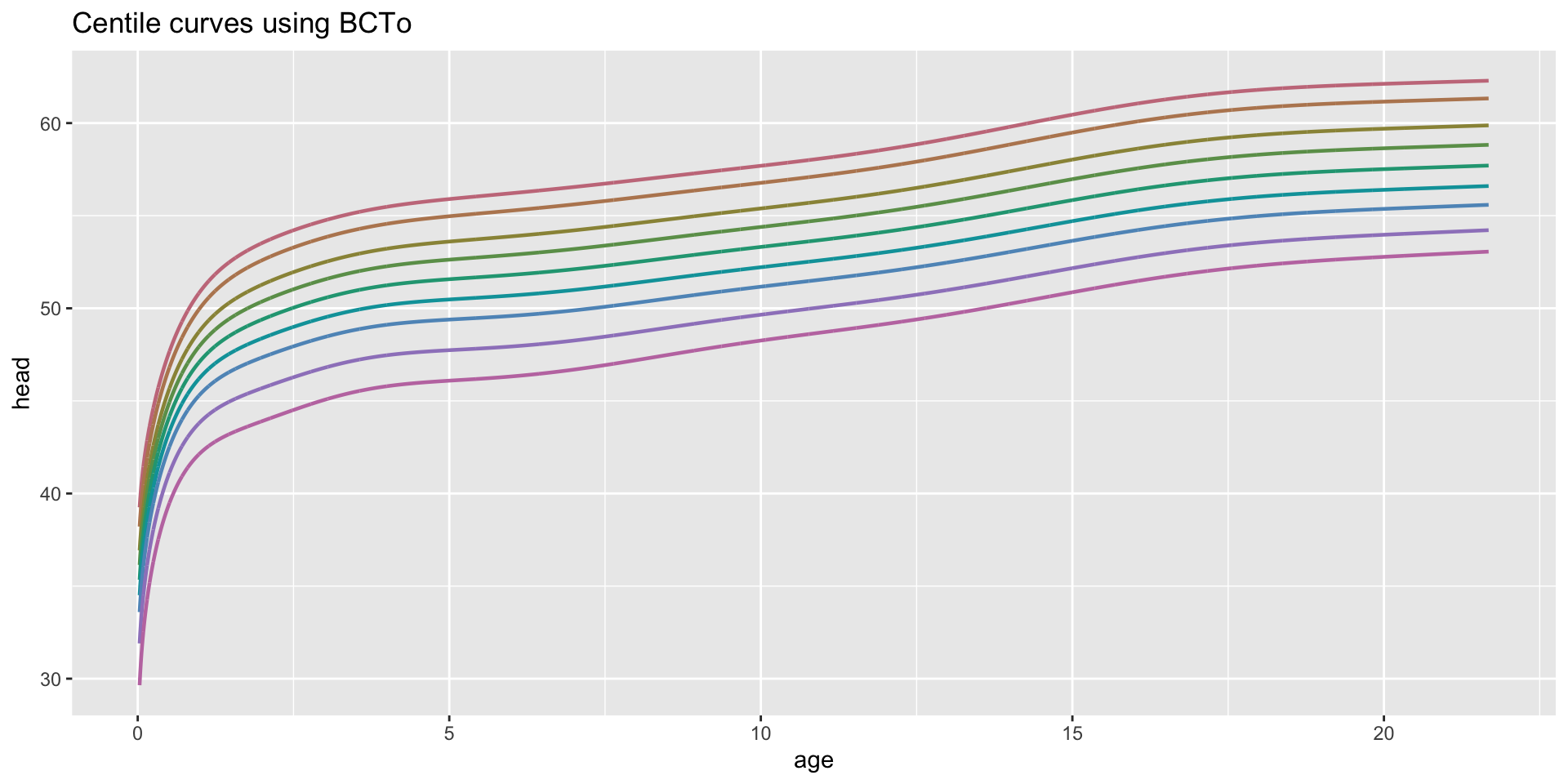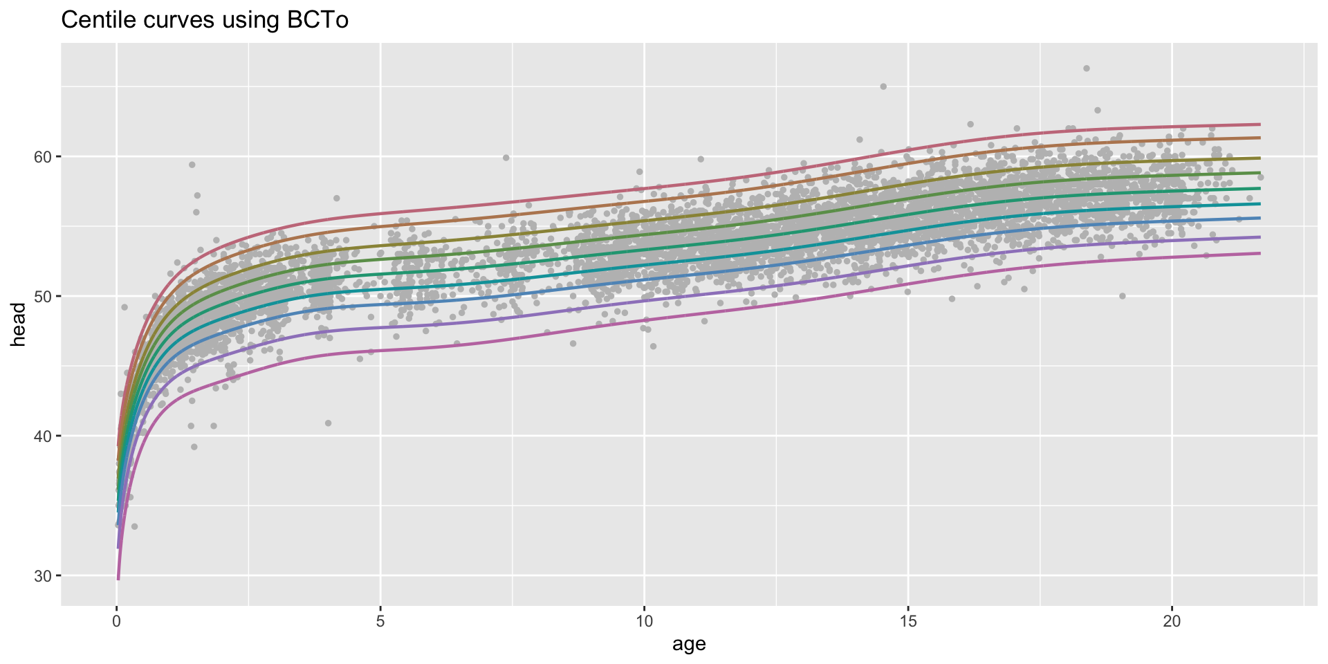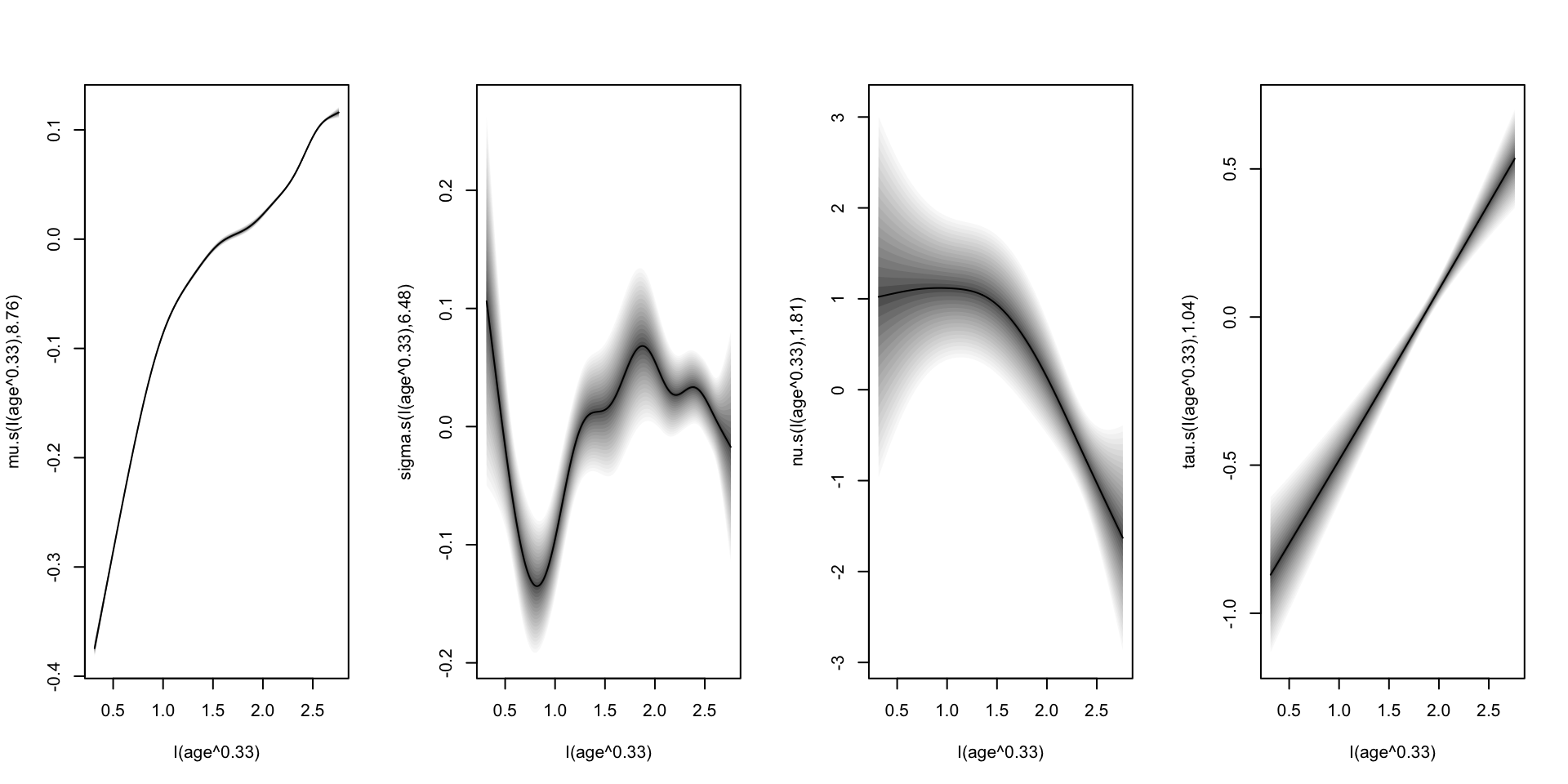 gBCTo <- gamlss2(head~s(I(age^.33))|s(I(age^.33))|s(I(age^.33))|s(I(age^.33)), data=db, family=BCTo)GAMLSS-RS iteration 1: Global Deviance = 26940.9697 eps = 0.390731