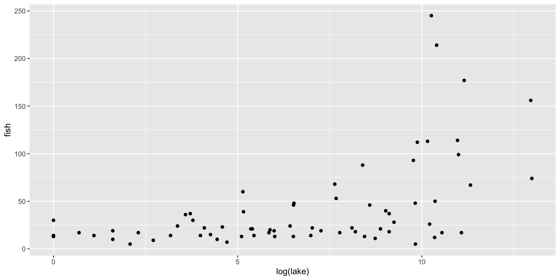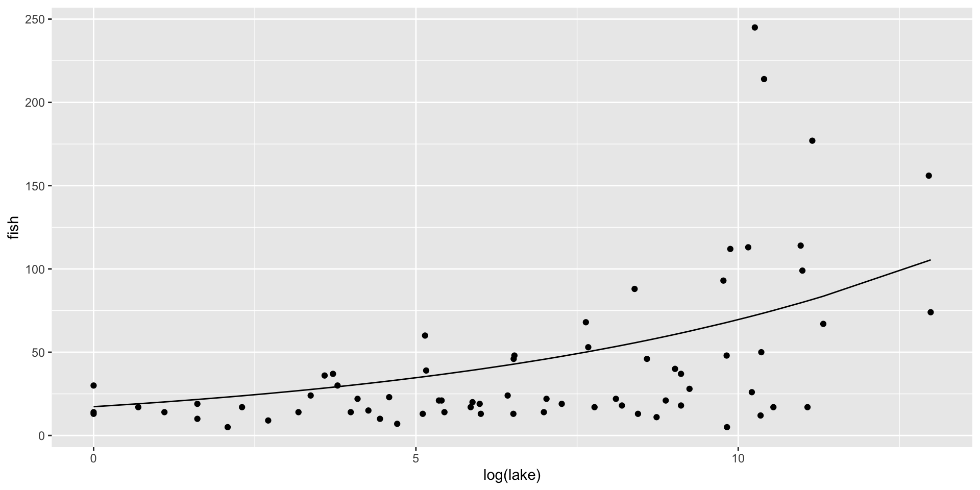 fish: the number of different species in 70 lakes in the worldlake: the lake area| Model | \(f_Y(y)\) | \(\mu\) | \(\sigma\) | \(\nu\) | GDEV | df | AIC | SBC |