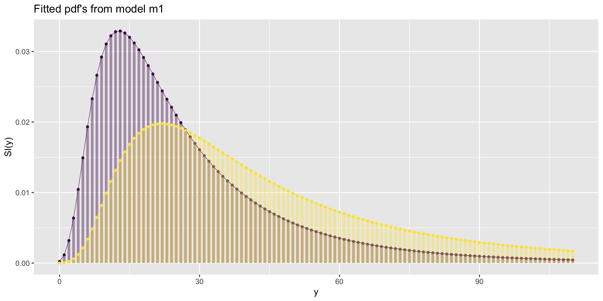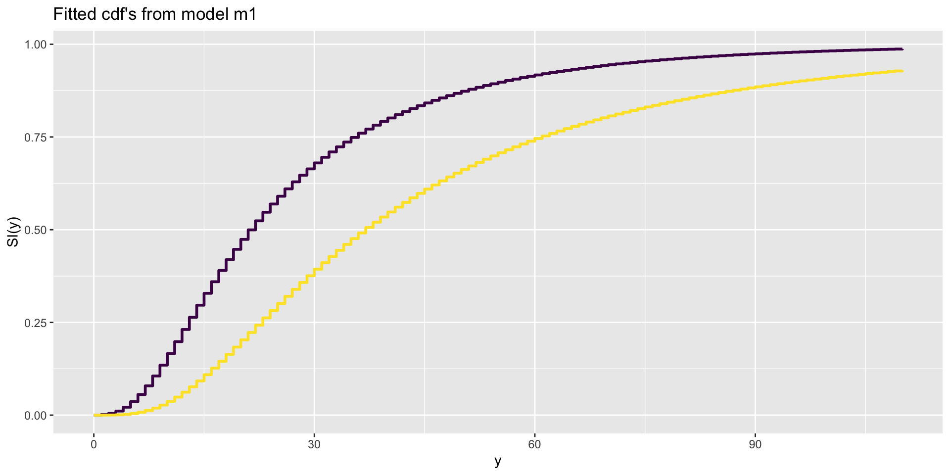 (iii) pseudo-likelihood (PL)Discretized continuous distributions for example if \(F_W(w)\) is the cdf a continuous random variable \(W\) defined in \(\Re^+\) then \[f_Y(y)=F_W(y+1)-F_W(y)\]