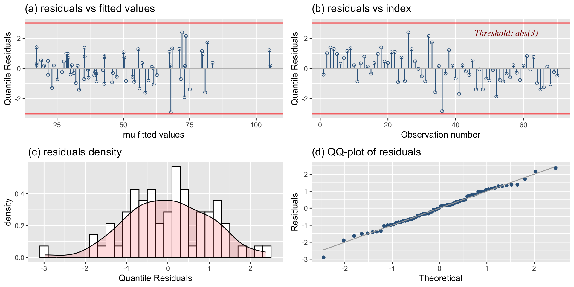 | Zero inf. neg. bin. | \((\mu,\sigma, \nu)\) | zero inflated gamma |