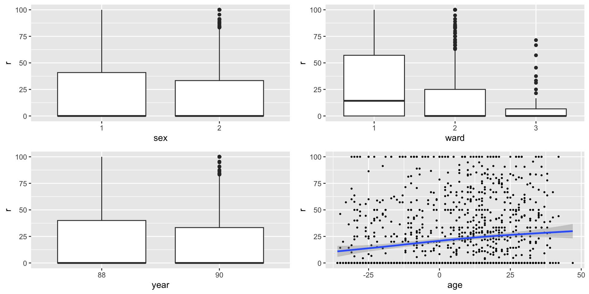 mIV <- gamlss2(y ~ ward + year + s(loglos)+s(age)| year+ward,