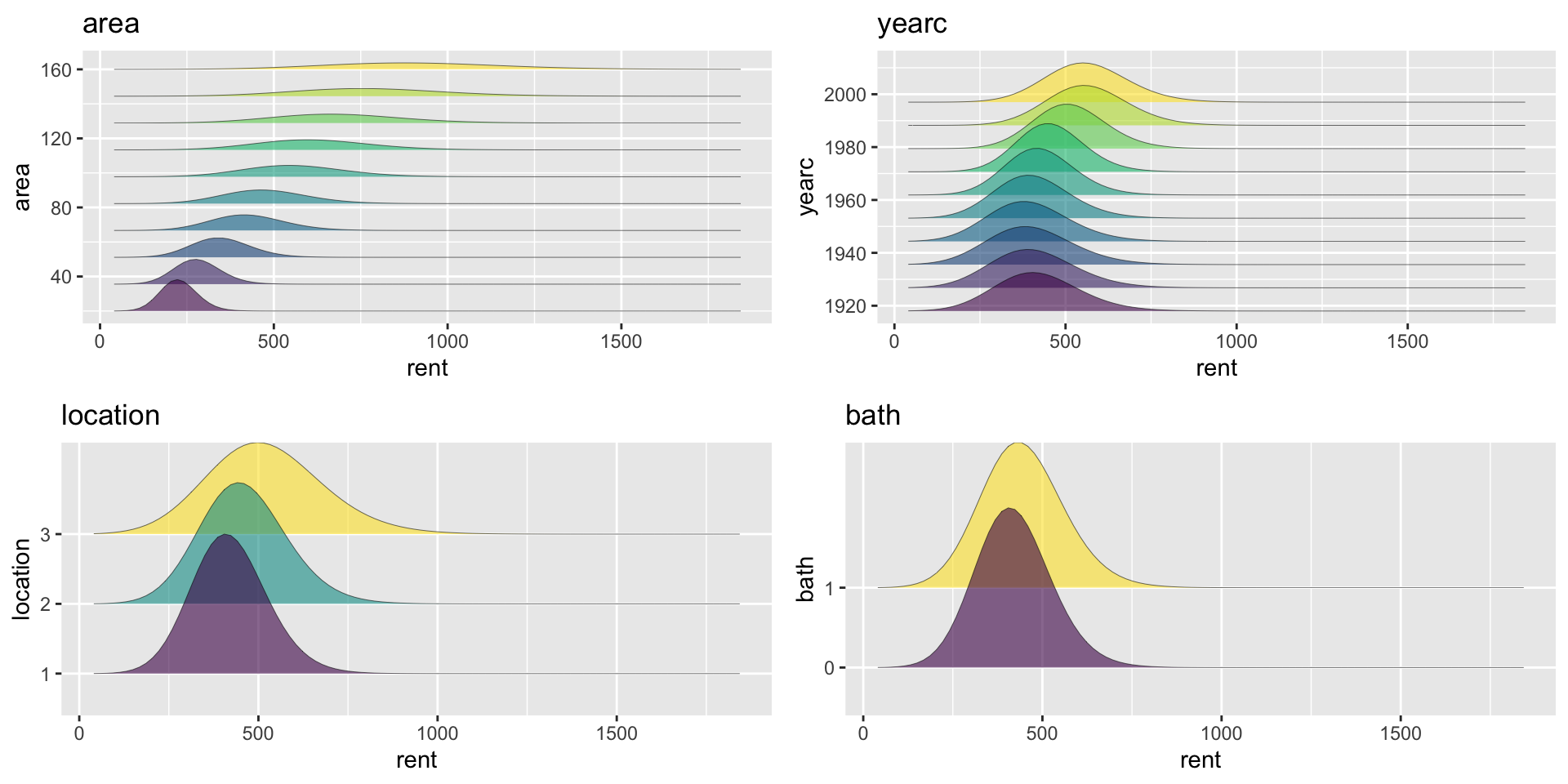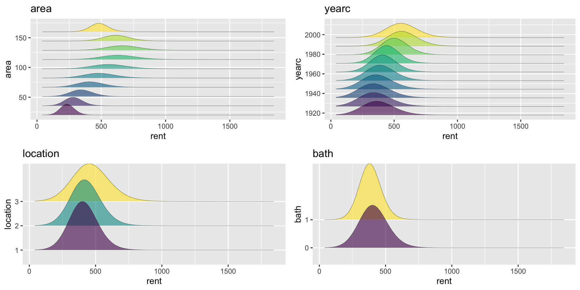 ndat <- data.frame(rent, area, yearc, location, bath, kitchen, cheating)