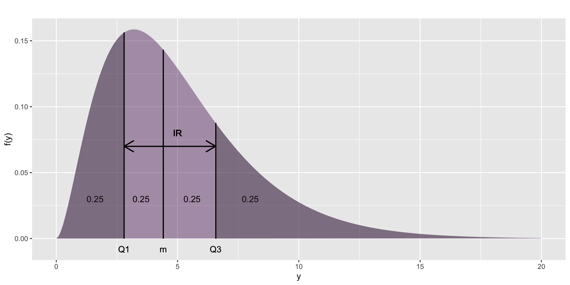 Figure 11: Showing how \(Q1\), \(m\) (median), \(Q3\) and the interquartile range IR of a continuous distribution are derived from \(f(y)\).