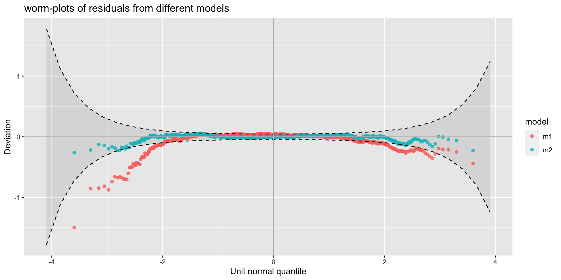 chooseDist() to fit a “linear” models for both \(\mu\) and \(\sigma\)chooseDist()(a) worm plots